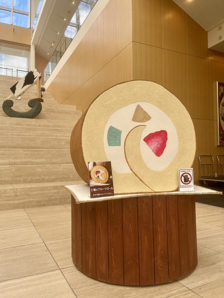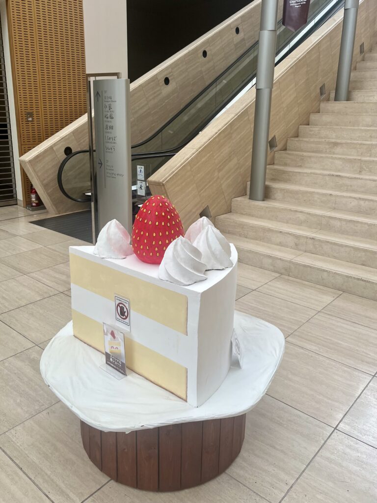ロビーの中央には、巨大なショートケーキとロールケーキのオブジェ。