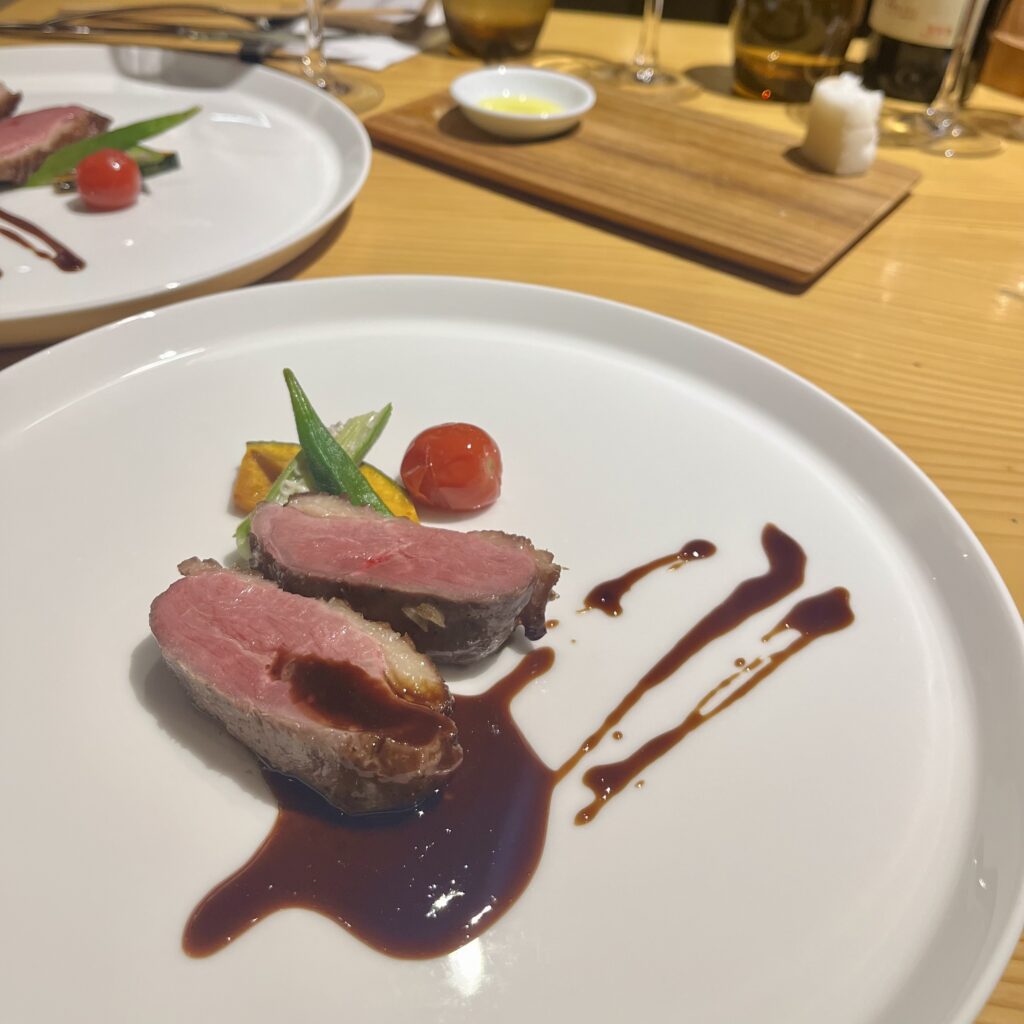 ナイフを入れると、ほのかな赤がのぞき、果実の酸味と鴨の香ばしさ、そして赤ワインの深みが、口の中で静かに重なっていく。