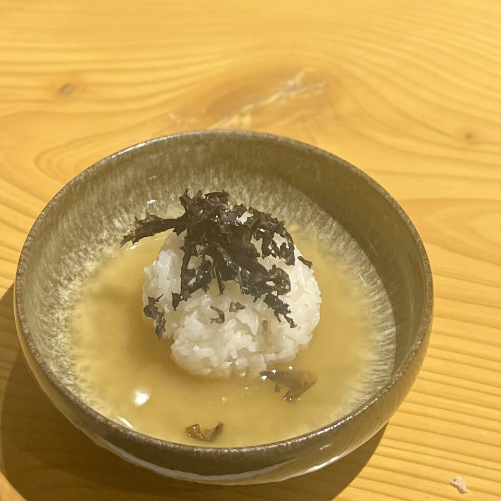 続いて、庄内産つや姫のおむすびと地魚の出汁。