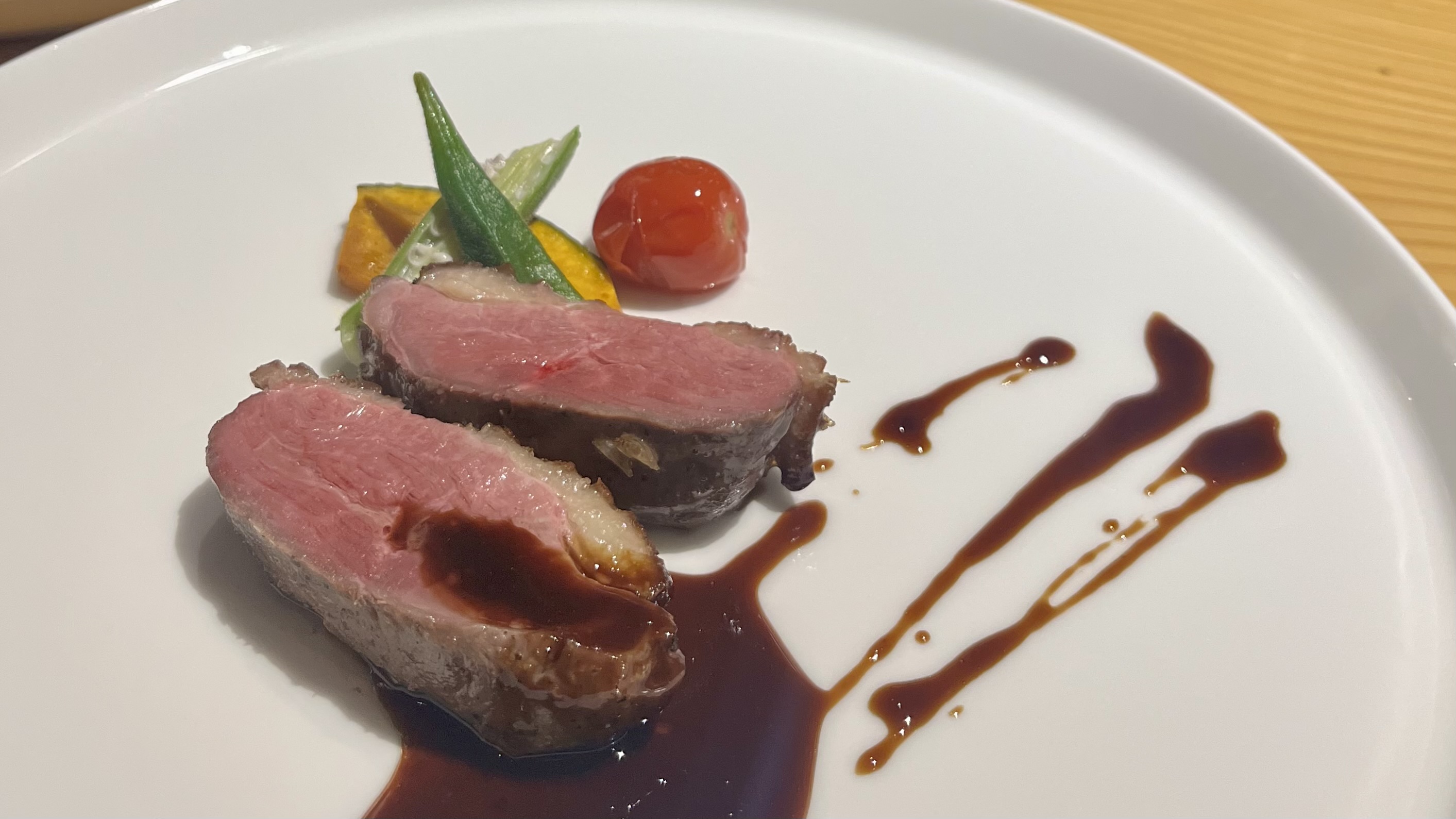 ナイフを入れると、ほのかな赤がのぞき、果実の酸味と鴨の香ばしさ、そして赤ワインの深みが、口の中で静かに重なっていく。