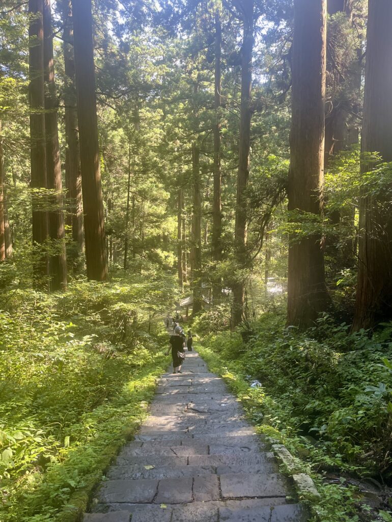 杉並木の下、石畳の坂を下るたびに、足音がやわらかく森に溶けていく。