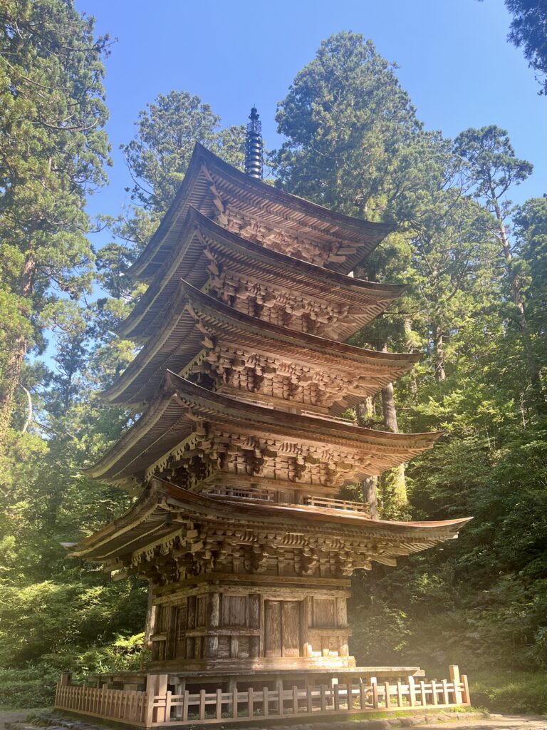 さらに進むと、木漏れ日の中に羽黒山五重塔が姿を見せた。